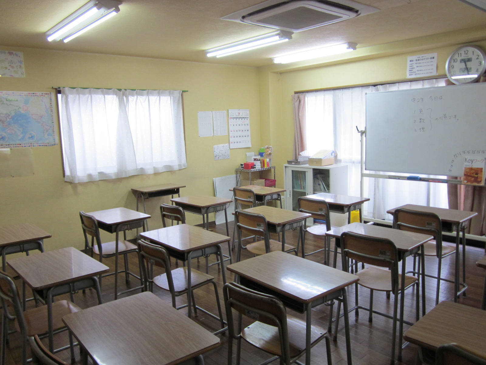 ホワイトボードもだいぶ汚れていますねぇ…今日は中2生の授業日です。予定より若干変更があったので指示を書いております。