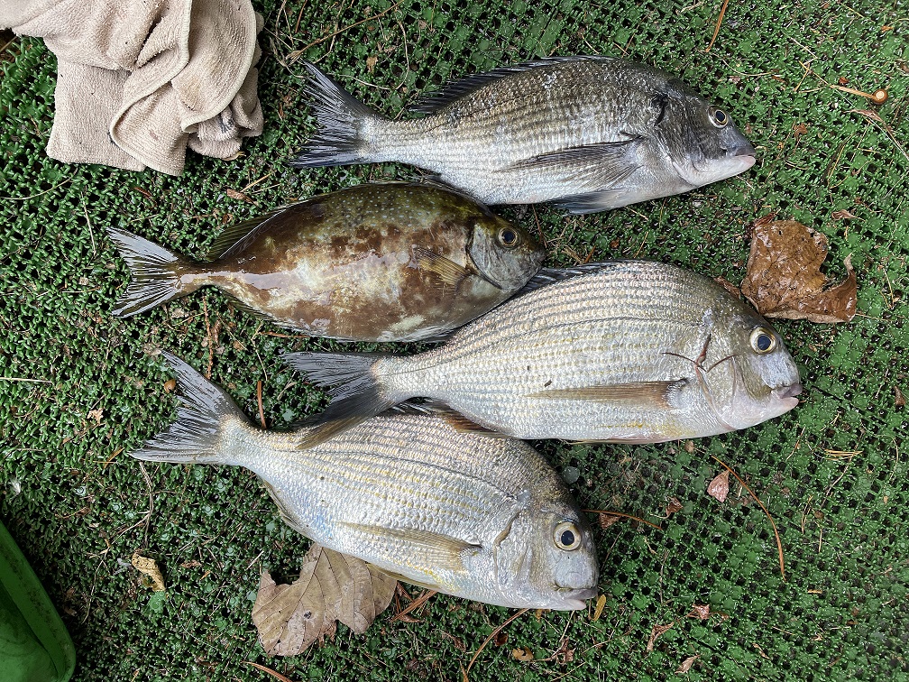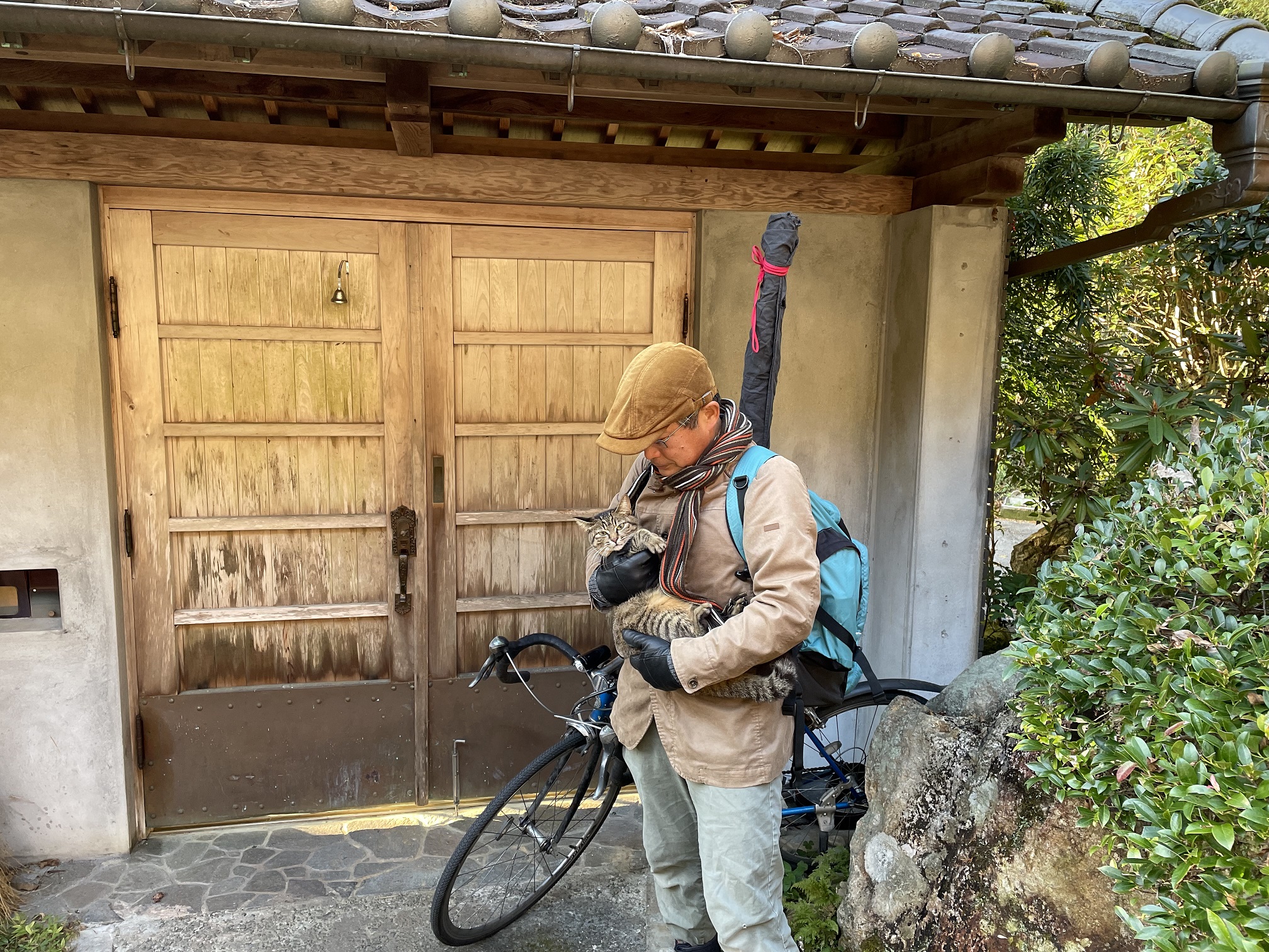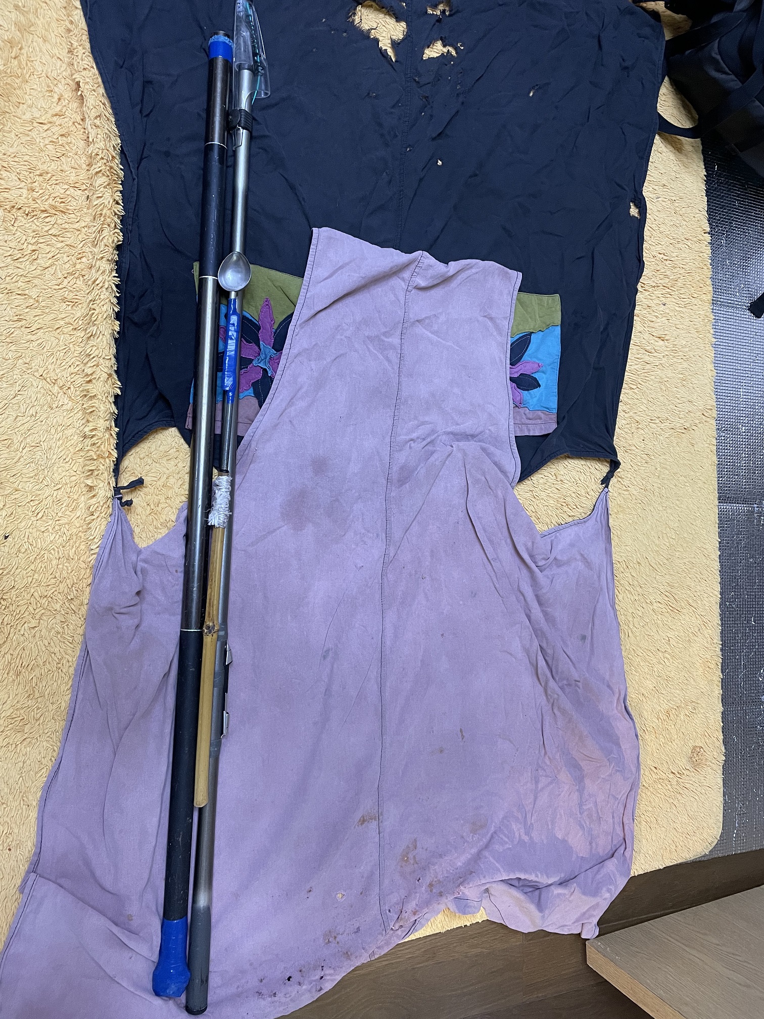 ロッドケースの代わりに妻のエプロンで竿をくるみます。