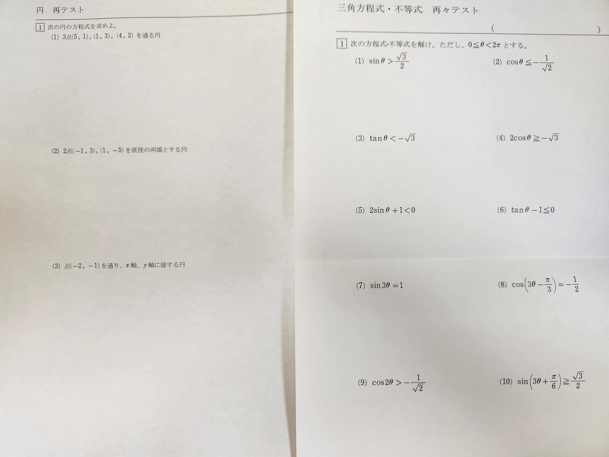 高2生は「円の方程式」「三角方程式・不等式」の再テスト