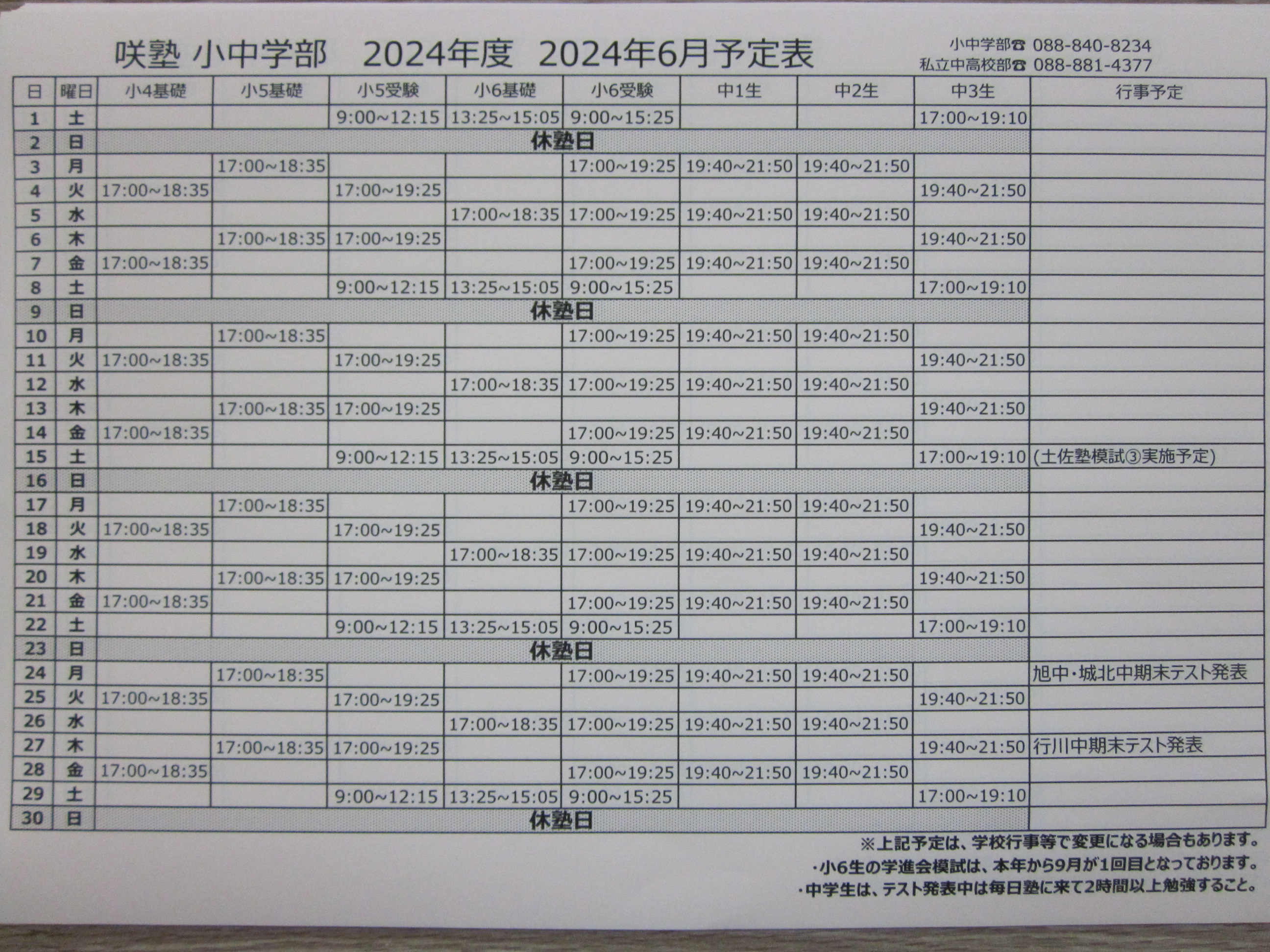 6月の塾内の予定は、特に何事もなく平常運転です。
