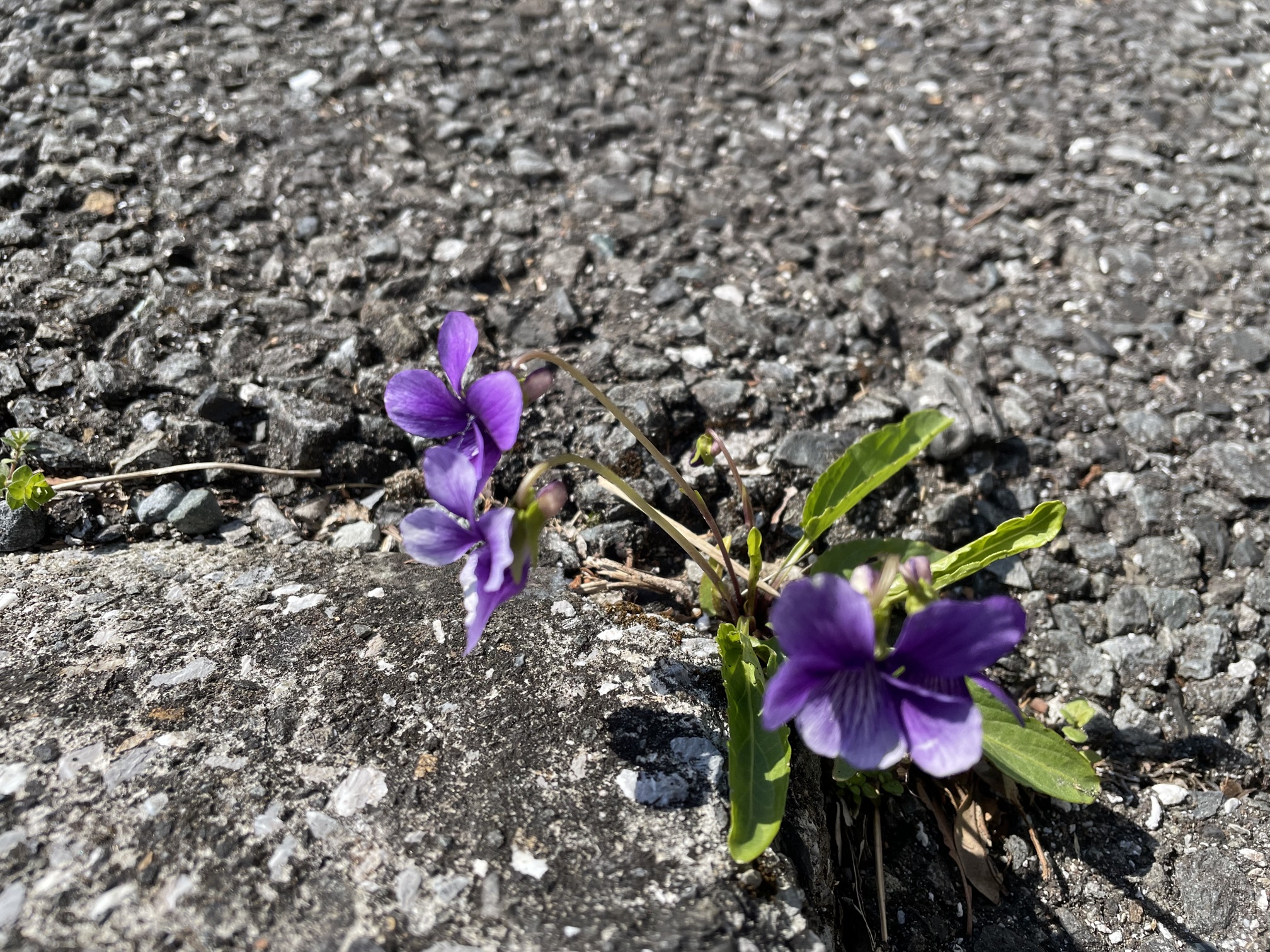 このスミレは毎年この場所にアスファルトのすき間から花を咲かせます。