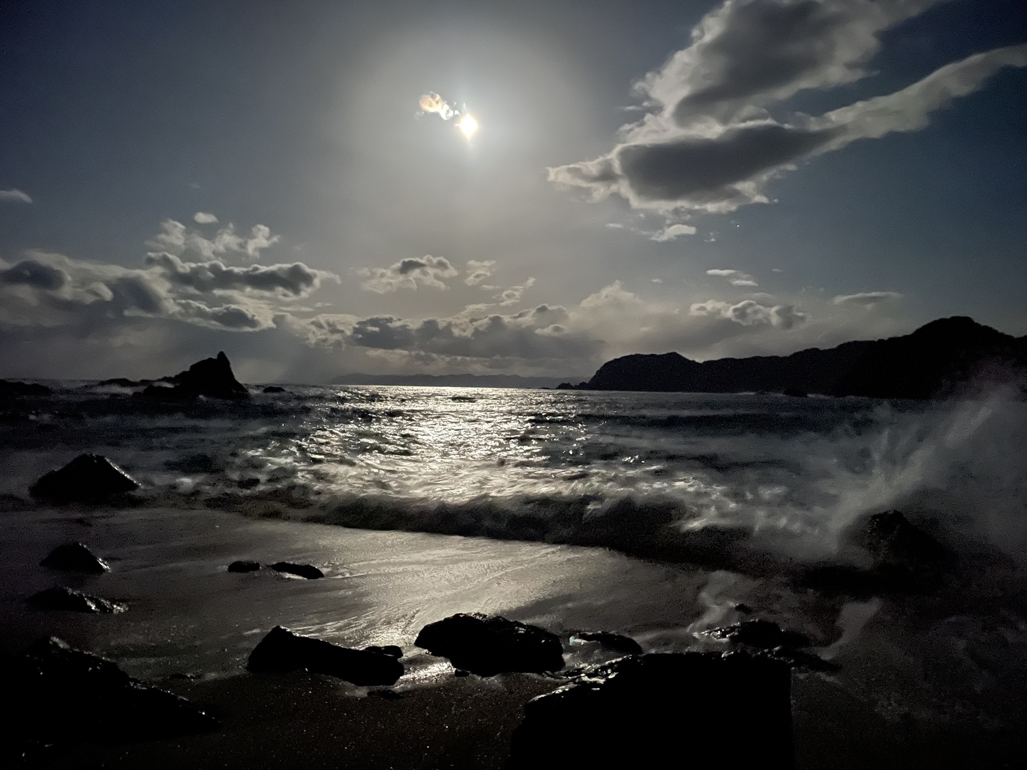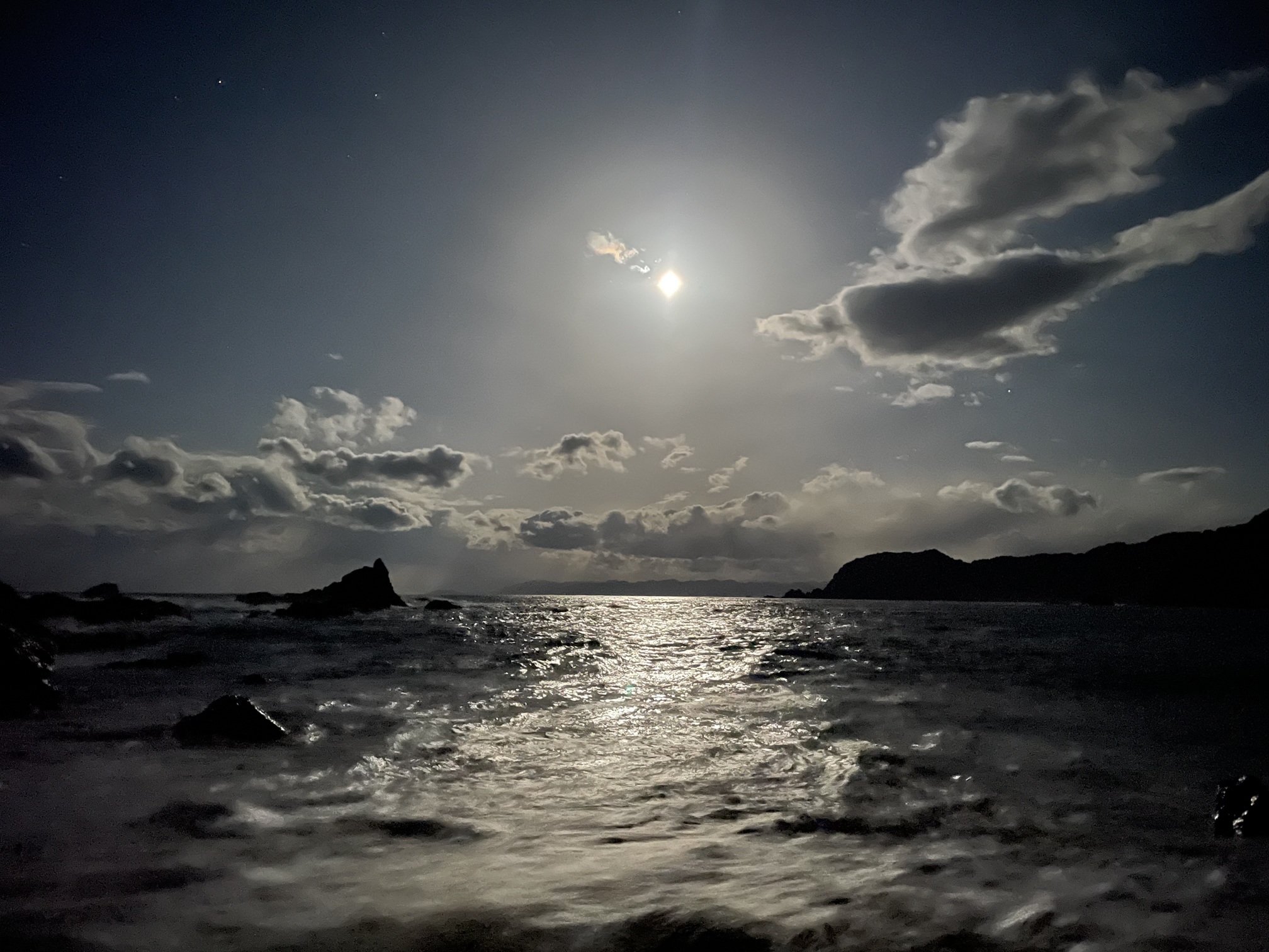 崖の下に降り立ち海に向かえば荒れた海面が月光で白く輝き、得も言われぬ美しさです。